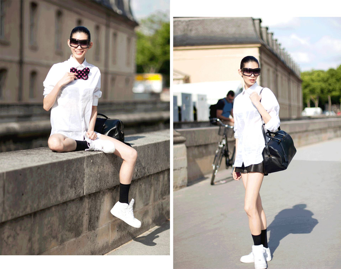 光泽感面料的白衬衫搭配超短小皮裙,露出大长腿,一副潜水员墨镜极具未来感,手拿卡通手机壳俏皮可爱,时不时还能用作摆拍道具。