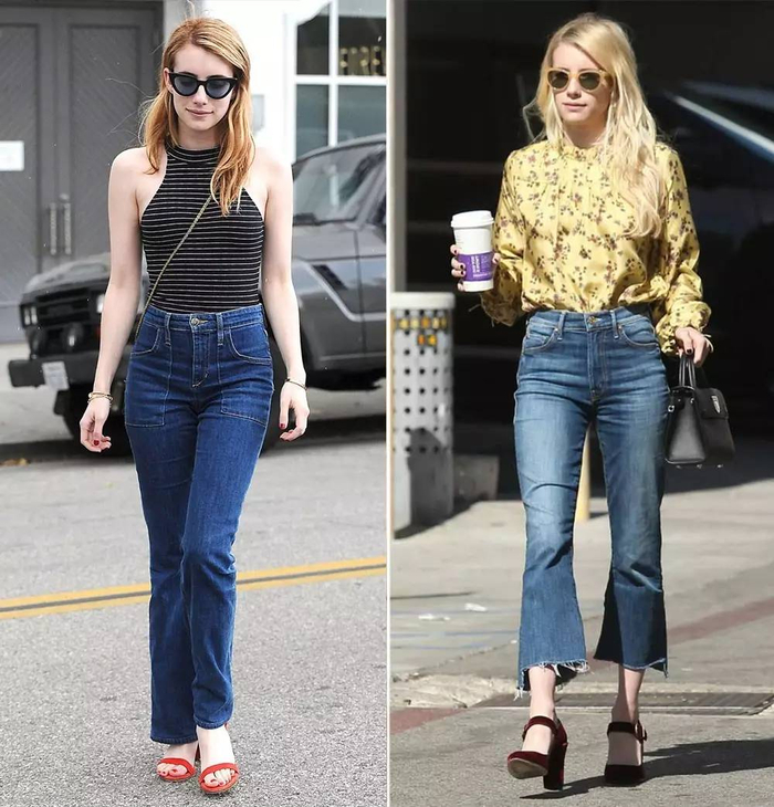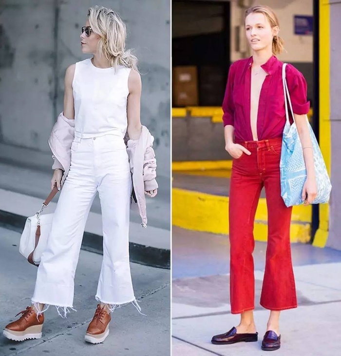 长喇叭裤显高大家都知道。短一截喇叭裤的显高能力也不差,而且它对小腿有一些修饰作用,还可以凸显细细的大腿和脚踝,更清爽也更适合夏天。对比一下。▼