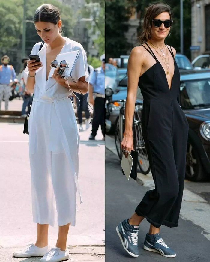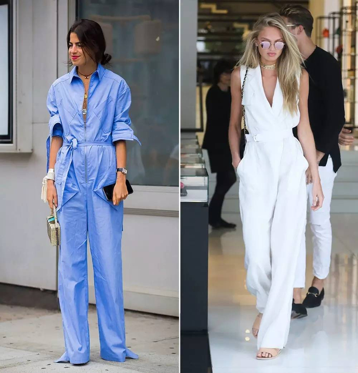 注意,我说的是高腰线、修身款的连体裤,而不是左边这种去年很流行的腰线低、又宽又大的工装连体裤,这种只有超模才能驾驭吧。对比一下。▼