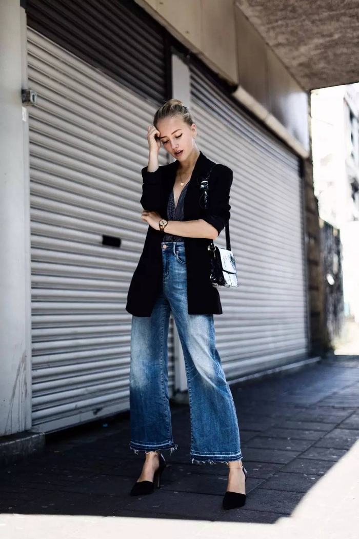 和阔腿裤一样,短一截喇叭裤想要穿出优化比例效果,同样要挑臀部合身的。另外一个重点是:大腿位置要紧身而不是宽松。大腿部位松松垮垮的短一截喇叭裤,舒服是舒服,但穿起来就完全是哈比人的灾难。▼