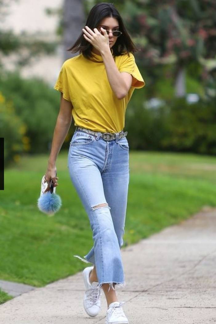 不难发现,超模在非正式场合的街拍中,不夸张地说也有六七成都在穿运动鞋,Kendall Jenner 自然也是典范之一。一件既宽松又再基础不过的黄色 Tee 轻松地塞进腰间,露出动物纹的腰带,勾勒出迷人腰线。磨边拉碎裤脚的牛仔裤与充满活力的运动鞋呼应着打造十足街头感!