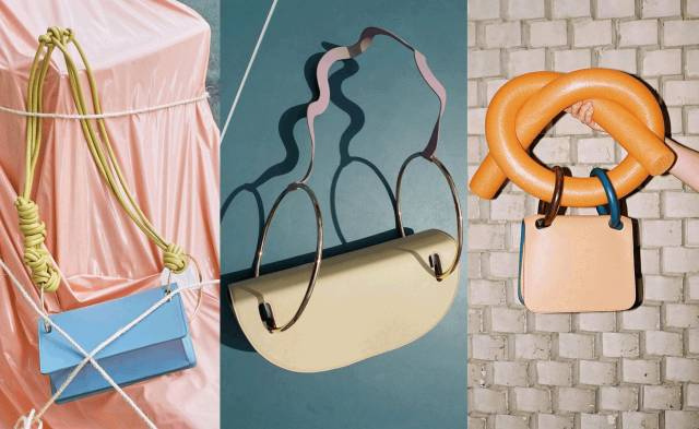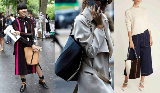 比如Proenza Schouler,今年有一款拼接包,上面的翻盖、手柄、缝合的地方全都用皮质丝带编织起来,还是有点夸张的卷曲设计,搭配撞色特别醒目,很有现代感。