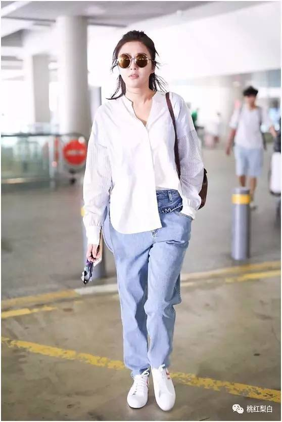 第一眼看觉得可能是完全不在乎搭配,怎么舒服怎么来,但是牛仔裤上的时髦大圆环装饰,和圆环上现在最流行的字母logo腰带,无一不透露着她有颗追赶时尚的内心。。……
