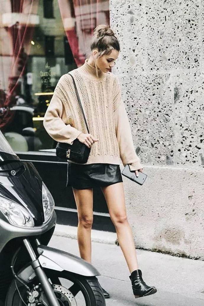 高领薄针织配上皮革短裙应该是今年秋天最时髦的造型了。