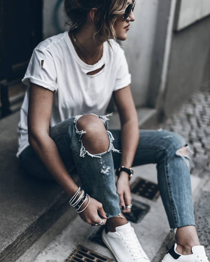 在夏天的穿搭一定要本着做减法的原则,炎热的夏天把大家都热晕了,哪还有心情里三层外三层的搭配啊?减少叠加搭配不代表就不时髦了,简单的黑T是永远经典的单品,破洞牛仔裤加持,如果搭配尖头鞋,那你就是职场轻熟女。如果搭配一双小白鞋,那你就是小鲜肉一枚。