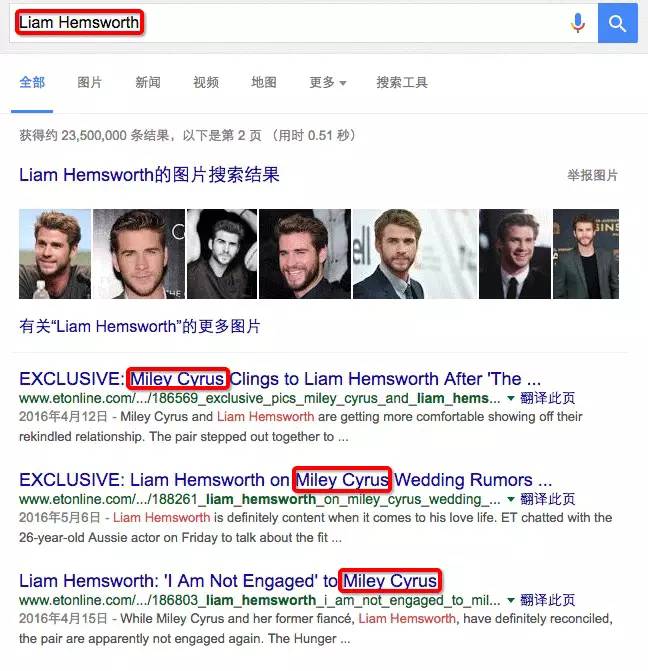 打开某搜索网站,输入关键词‘Liam Hemsworth’,前排全是他和女友的花边新闻,本人毫无一丝存在感: