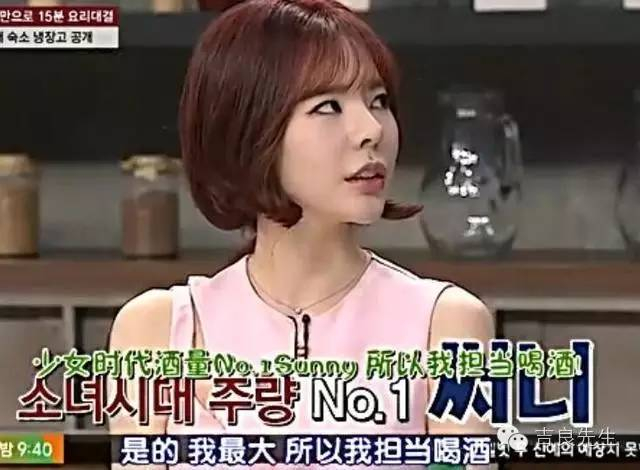 少女时代的Sunny是个十足的酒鬼,在少女时代公用的冰箱里放满了各式各样的酒。