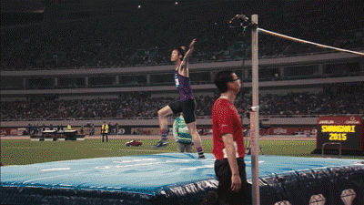 他的招牌动作就是在跳高杆前面表演一记白鹤晾翅,