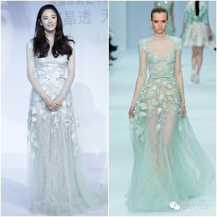 你看她穿那种华丽丽的大礼服,就从来都不把自己往死里勒,这条Elie Saab 2012 春季高定的裙子,模特是瘦削的,可是张雨绮是匀称的身材,还特意在腰部做了小装饰来营造视觉上的分界线,所以就显得腿很长的样子: