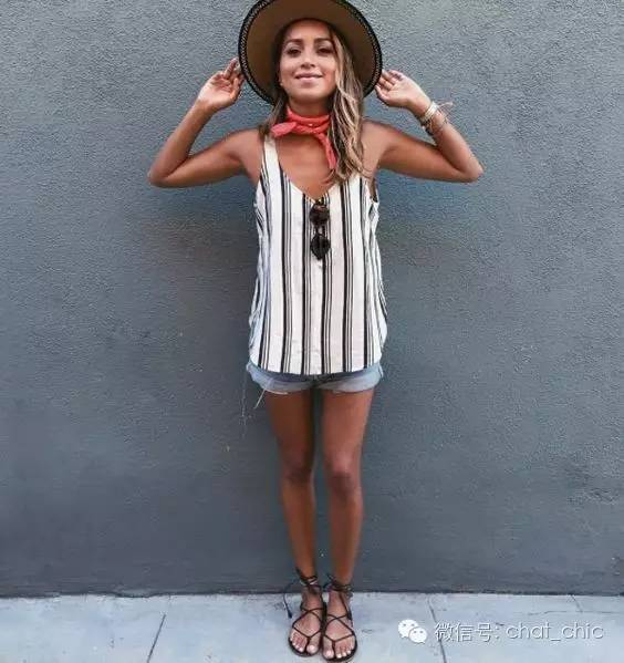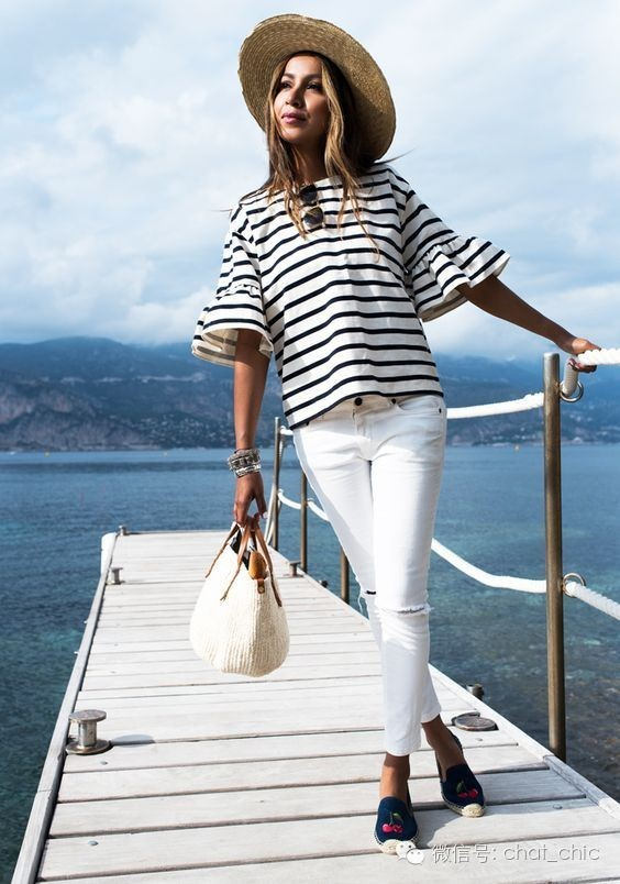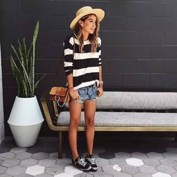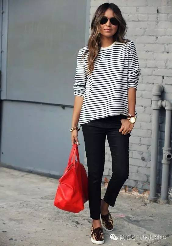 这样的配色,主要是各种样式的条纹,不止让造型变得紧凑,还将焦点保持在上身,弥补了不够高挑的缺点。(这样搭,也不错: 波点+条纹,撞出好身材,刷出存在感)