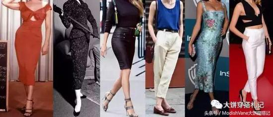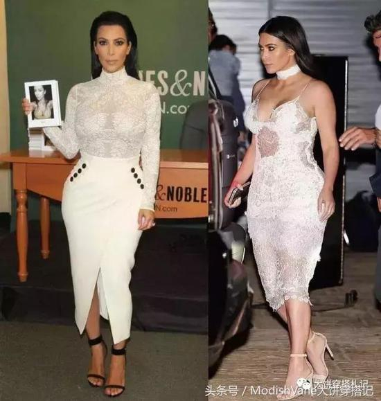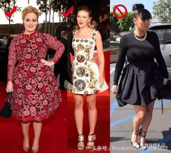 而在选择下半身款式的时候,切记不要选择会包裹出腰腹部分的包臀裙、铅笔裙,选择略有一些松量的A型裙效果会好的多。但是无论如何,切忌最右卡戴珊身上的那种高位百褶裙,会非常非常显肚子!