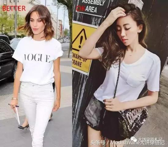 See,在同样没有高腰线辅助、且同样都是V型领的情况下,左边Queen S的垂坠感T恤就比右边的要显瘦的多。