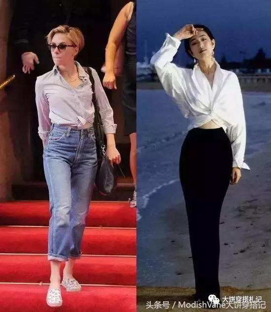 斯嘉丽和巩皇身上穿的还算是面料比较具有挺括性的衬衫,但是在利用了打结的方式之后,纤纤细腰被展示出来,也一样显瘦。