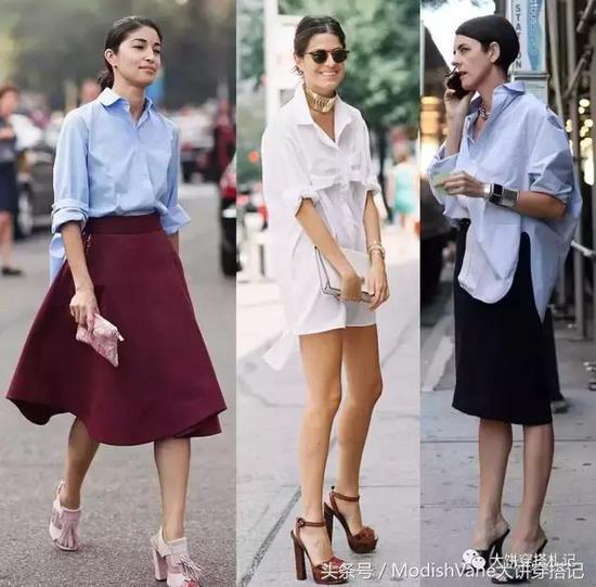 大部分版型偏合身,且面料硬挺的衬衫对于大胸姑娘来说,都容易穿“土气”。See,人美身材又一级棒的可儿,在相同的搭配组合下,不同材质的衬衫,左边的垂坠感强,无形之中就拉长了纵向视觉感;而右边的,要不是有可儿一双纤细的大长腿救场,那种灵动感、时尚感真正是差了一大截。