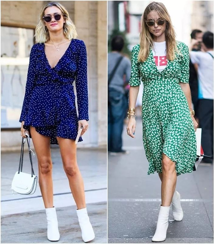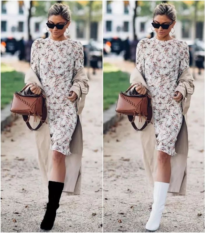 今年很流行的女人味满满碎花裙,搭小黑靴帅气,搭小白靴则清新有活力。▼