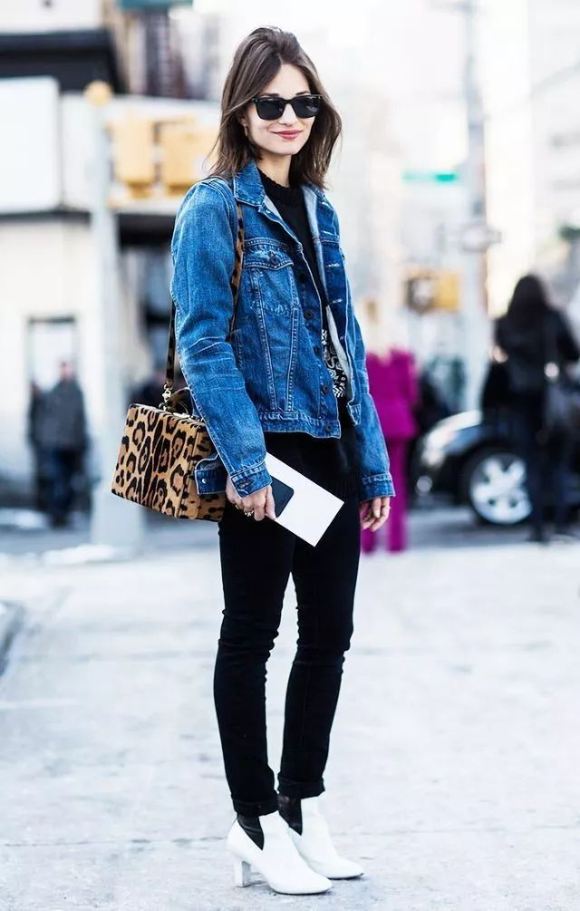 一身黑再搭配一件牛仔外套,你应该也这样穿过吧,下次再配小白靴试试,时髦度陡增。刚刚说黑色紧身裤和小白靴容易把腿变成两截不显腿长,像她这样选择靴口有黑色装饰的就会好很多。▼