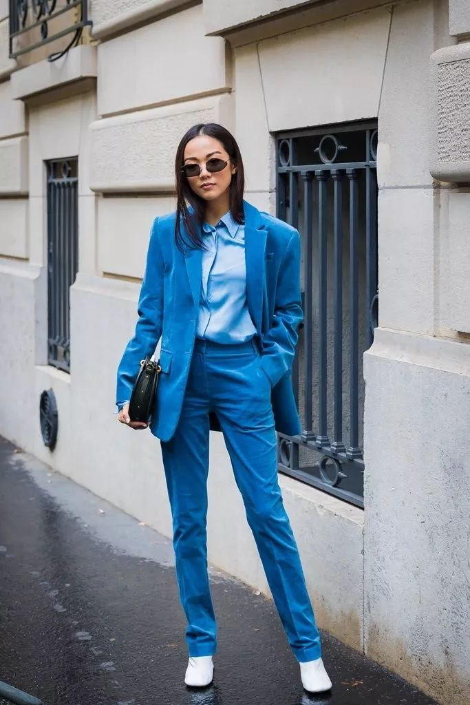 一身蓝的搭配视觉冲击力非常大,有了小白靴的点缀,看起来会更轻松一点。▼