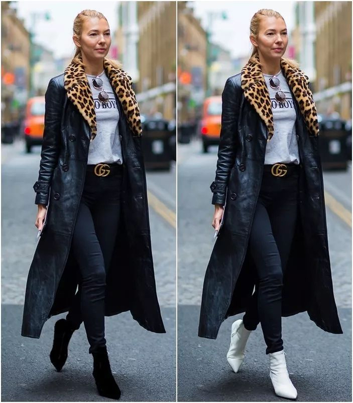 冬天的衣服大多是深色,如果循规蹈矩再搭配一双黑色的鞋,当然也不会出错。但换成小白靴后,造型显得轻盈很多。我们试着把这个小白靴的造型P成小黑靴,对比一下:▼