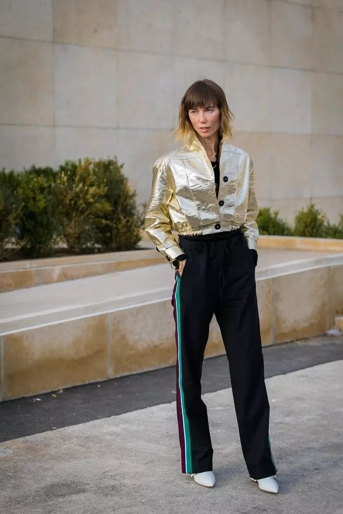 这种金色外套也是不好穿的,所以,下半身选了黑裤子和白鞋子来做平衡。▼